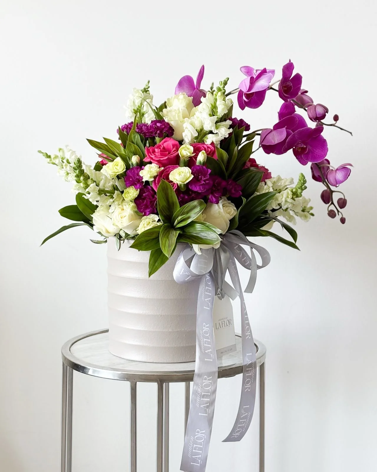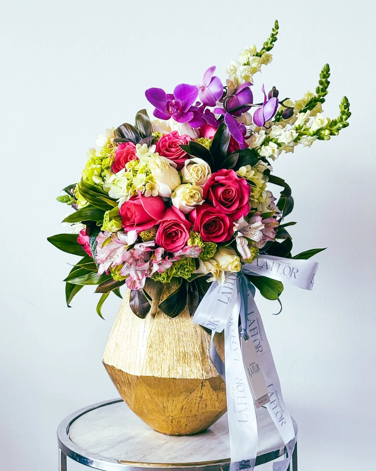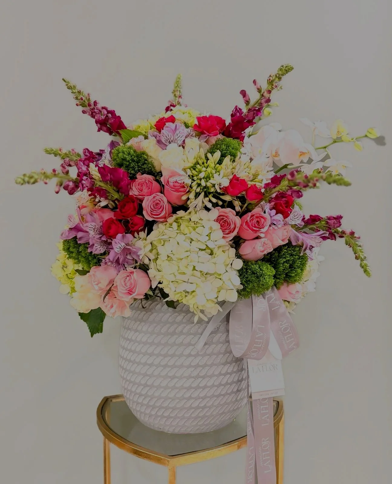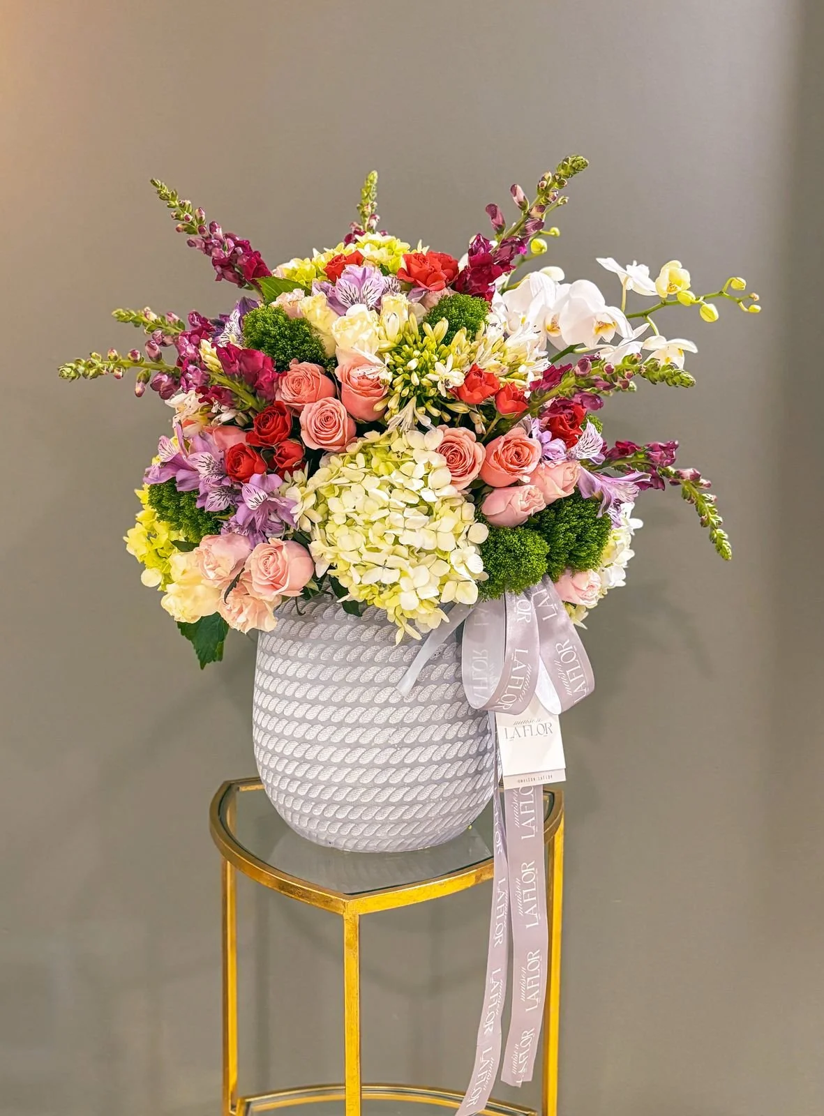 Composición exclusiva con rosas, hortensias, claveles, astromelias, dragón y coronada con orquídeas